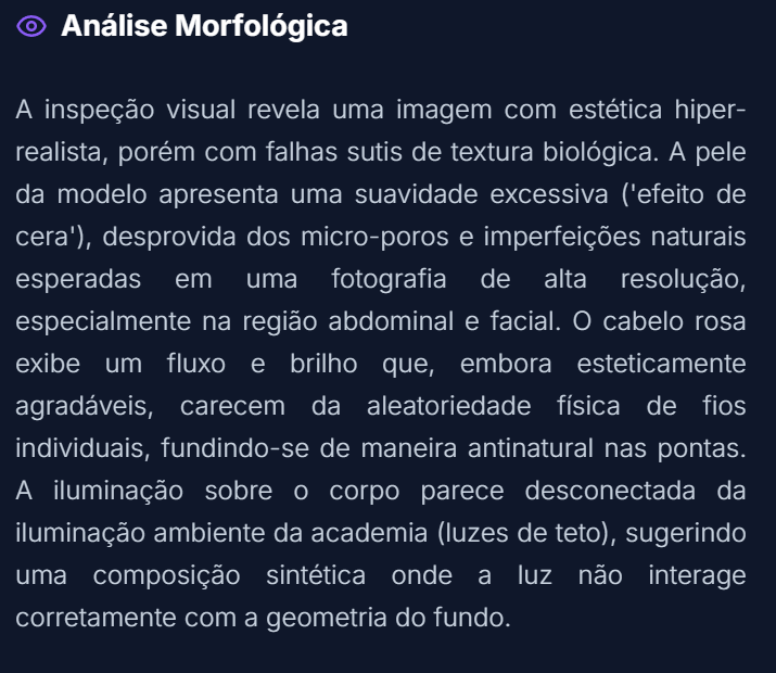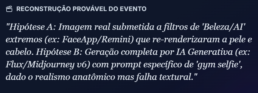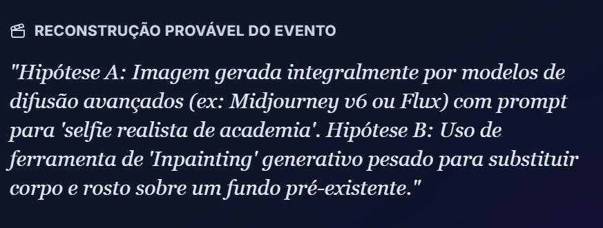 A IA Núcleo de Consenso Trinity identificou corretamente o uso de Midjourney v6 ou Flux e prompts específicos de "selfie realista". As texturas originais estavam preservadas.
